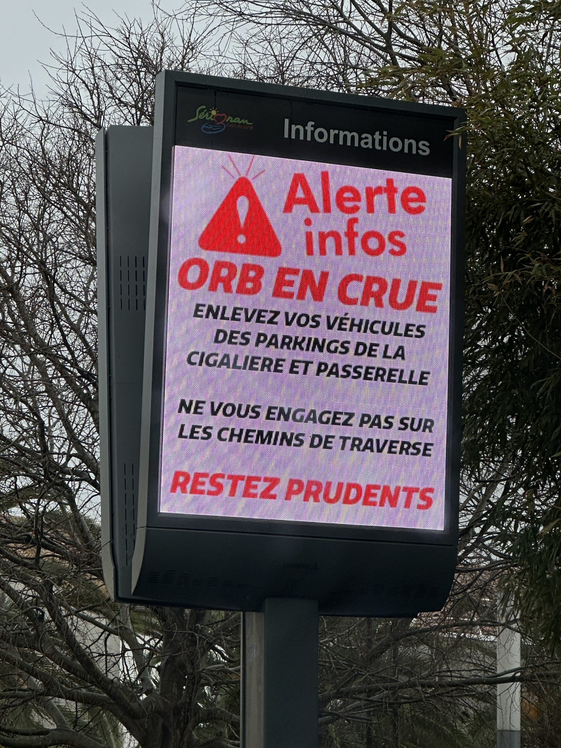 L’Orb continue de monter. La prévision haute au pont Neuf à Béziers est de 12m à 18h. Nous sommes donc dans une crue comparable à celle du 13 mars 2022.