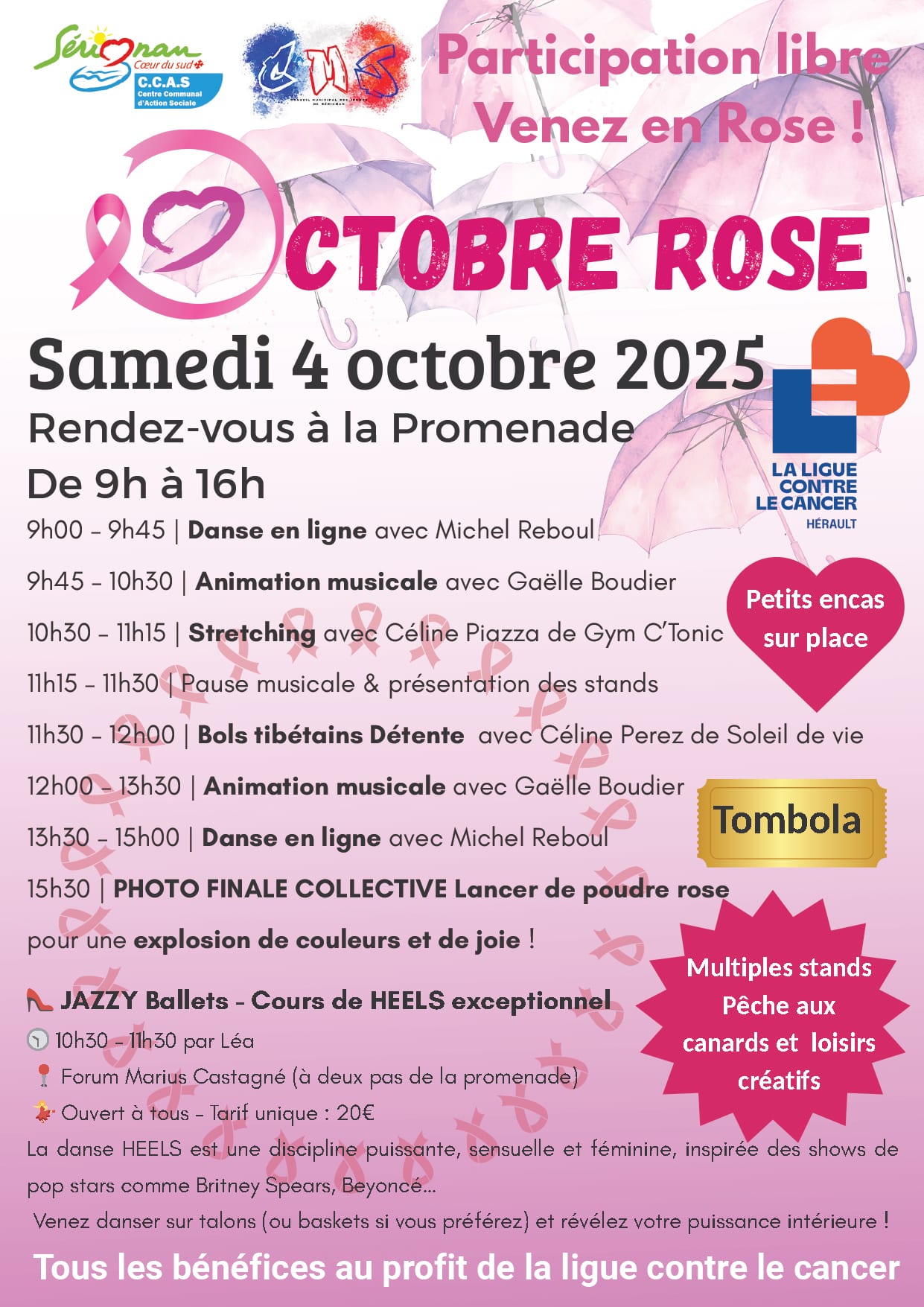A noter Sérignan est particulièrement mobilisée pour Octobre rose, avec de nombreuses actions proposées par différents acteurs du territoire, des commerçants, des associations et des partenaires : le Tennis Club, Sérignan Loisirs, le restaurant Ma Ferme, le RCPO Rugby Club, le club de Football, l'Association des Travailleurs Retraités de Sérignan, les Cigales, le club de Pétanque, mais également le Lycée Marc Bloch et Dynapole.