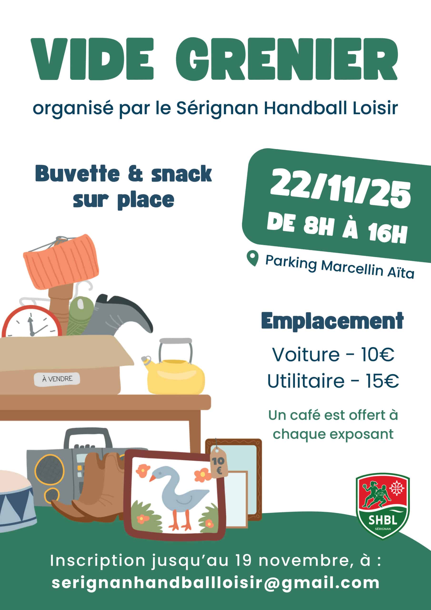 L’Association Handball Loisirs de Sérignan organise un vide-grenier le samedi 22 novembre, de 8h à 16h, sur le parking du Stade Marcellin Aïta.
